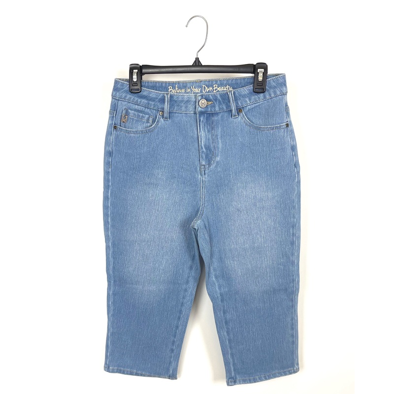Brand new - donated from the designerBelle by Kim Gravel light wash capri jeans with zip up button up front and front and side pocketsSize 6 (Kim Gravel runs big and according to their size chart, a 6 is a size small)92% cotton, 8% spandexEstimated Origina