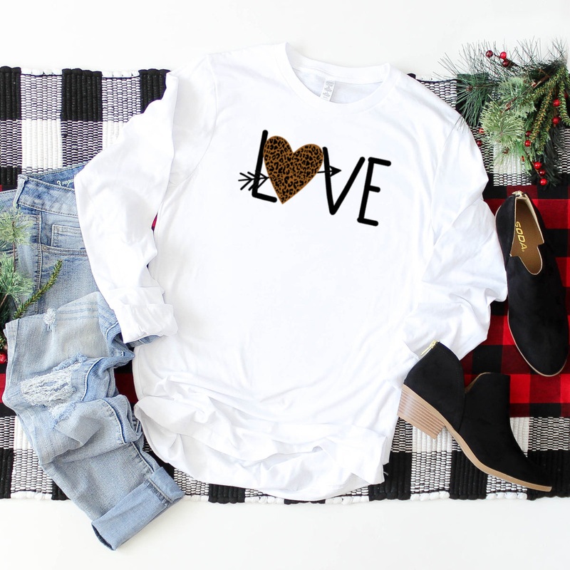 Long Sleeve: Love With Leopard Print Arrow Heart-Plus Sizes