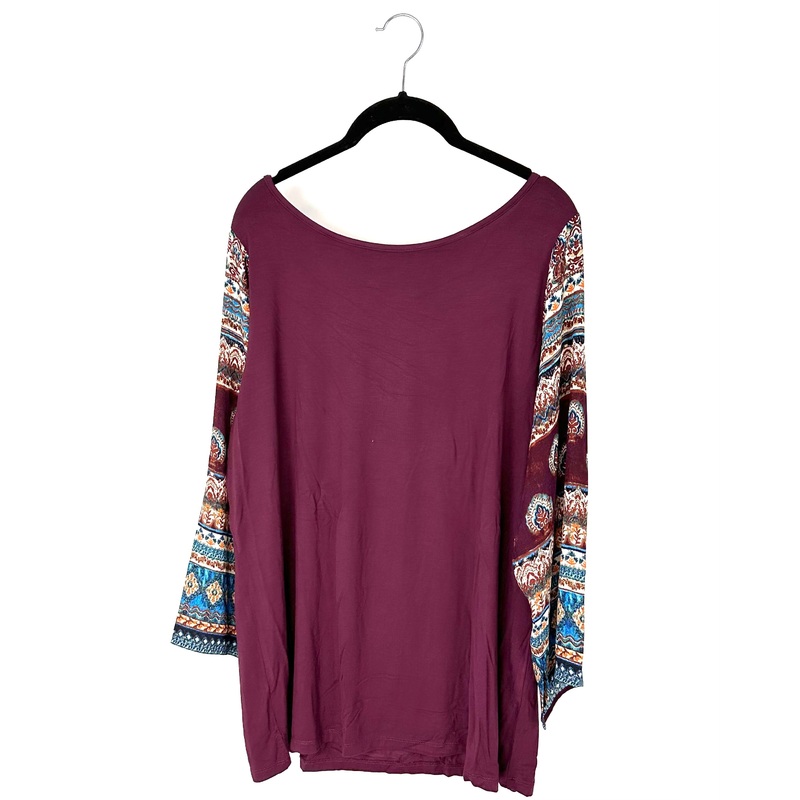 Belle By Kim Gravel maroon with abstract patterned sleeves, made from lightweight and soft materials.