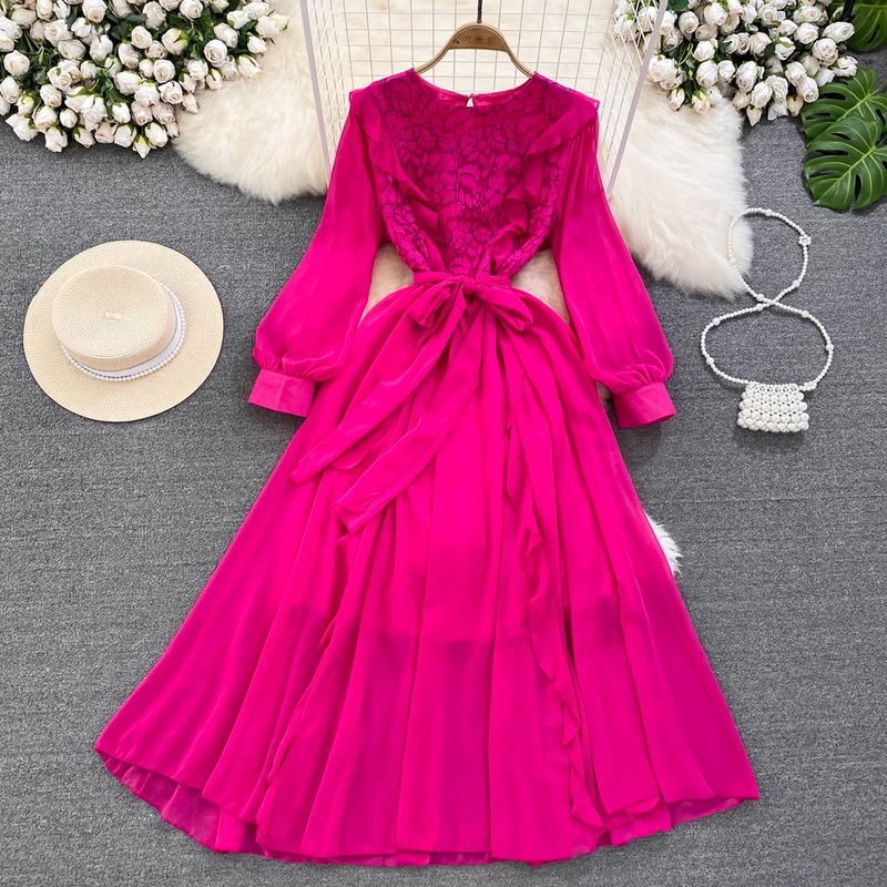 Long Sleeved Round Neck Lace A Line Ruffled Dress Elegant Long Skirt 1540