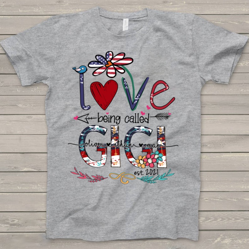 Love being Gigi flag artGreat as Birthday gifts or Holiday presents. This adorable item can be designed upon anyone's wish with any title.Please enter:1. Nickname: Mimi, Grandma, Nana, Gigi ...etc.2. Kids' Names wanted on the shirt (Names separated by comm