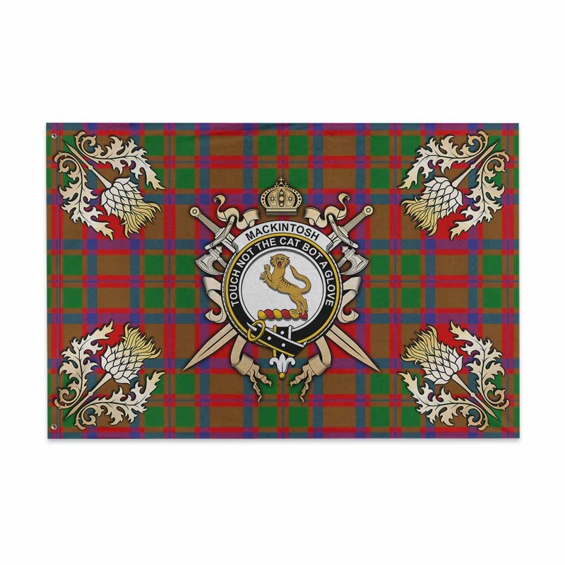 MacKintosh (McKintosh) Tartan House Flag with Family Crest and Golden Thistle Crossed Sword Design