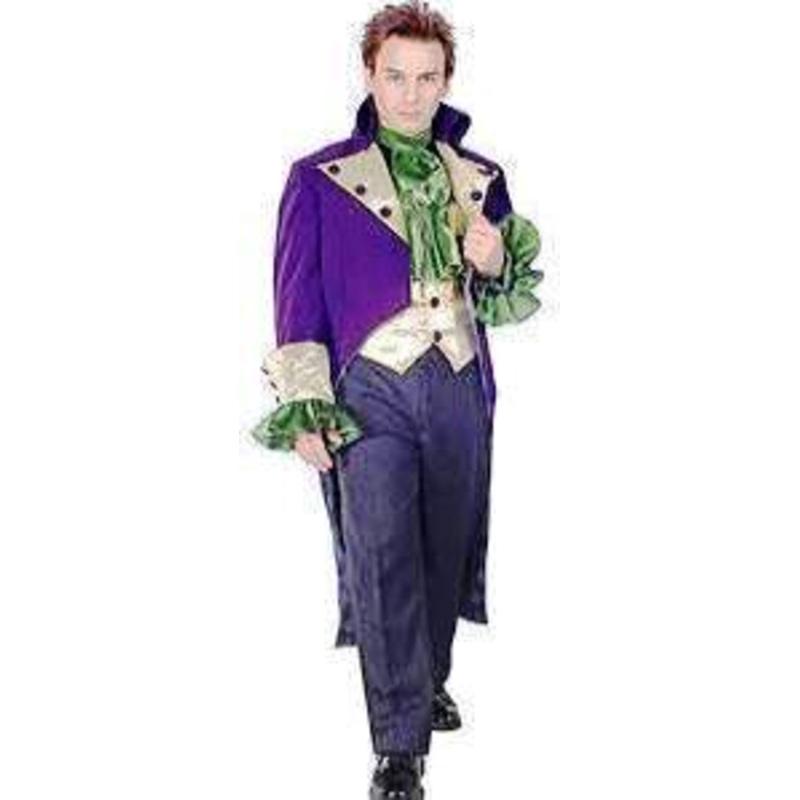 R90995Includes: Purple Jacket with gold lame lapels and cuffs, contrasting green satin jabot, gold lame vestand black pants.Color: As Shown Size: S (34-36), M (38-40),L (42-44), XL (44-46)