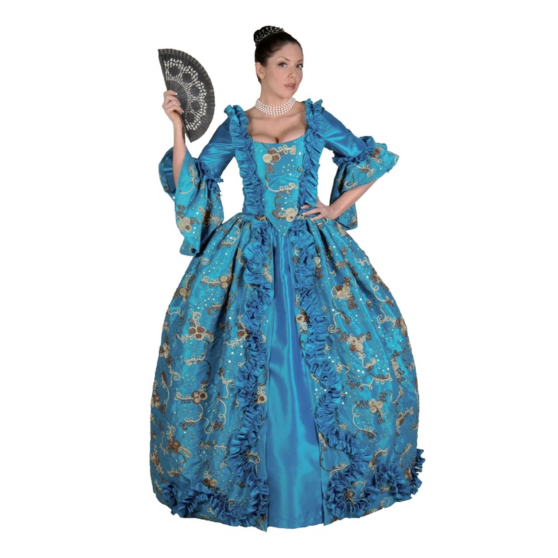 Marie AntoinetteMade in the U.S.A.High-quality taffetaDress w/ full underskirtRuffles on blouseskirt front