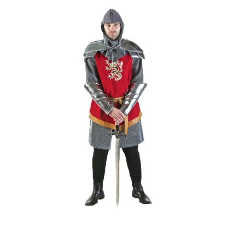 Includes: Tunic with embroidered lion crest and lined Metallic mesh sleeves / Lined Hood and Undertunic (skirt) / Black knit Pants/Leggings / Silver shoulder guard / attached arm guards / belt.Made in U.S.A. / High-quality fabricColor: Red/Silver (shown)Si
