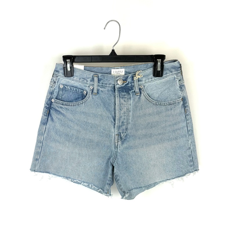 New with tags - donated from the designerZ Supply medium wash high rise denim shorts with silver front button closure, belt loop, front and back pockets, light brown stitching, and distressed bottom hemlineSize Small (Size 27)100% CottonEstimated Original