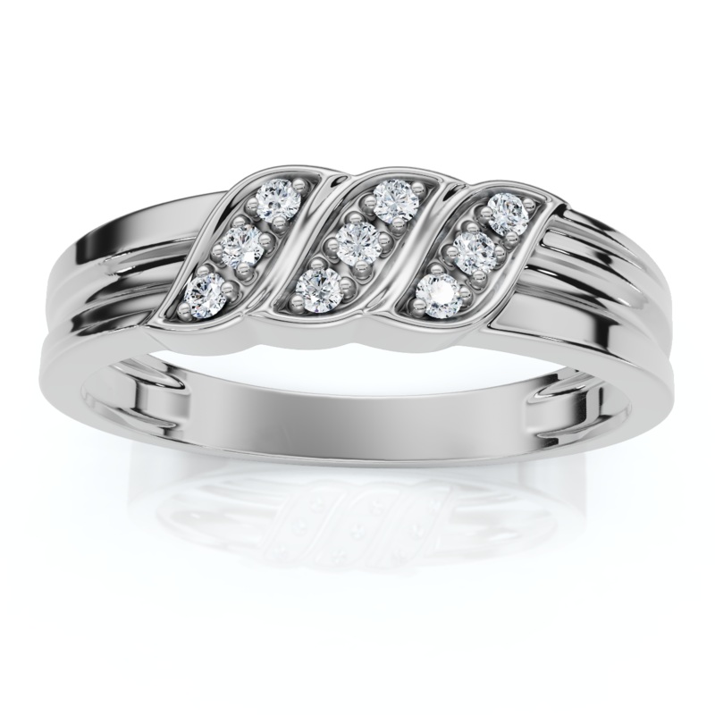 This men's ring features nine round cut natural diamonds set in solid 10k white gold.Item #: ENG00203MWidth: 4 mmWeight: 3 gMetal: 10k White GoldDiamond Cut: Round, BrilliantDiamond Color: I/JDiamond Clarity: I2-I3Diamond Carat: .08Diamond Quantity: 9Diamo