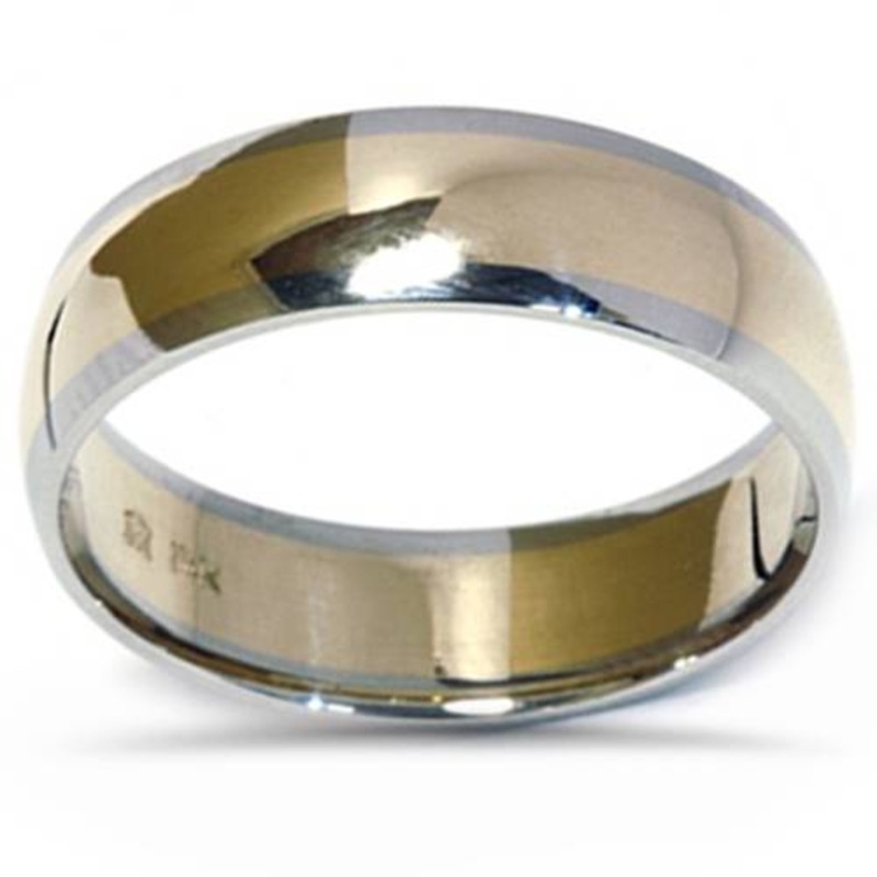 This popular plain wedding band features a yellow gold center and white gold edge. *The picture shows more of a contrast, colors are enhanced to illustrate detail.Item #: WB1858Width: 6 mmWeight: 5.5 gMetal: 14k Yellow Gold
