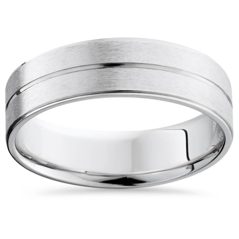 High quality solid 6mm 14k white gold wedding band. The combination of a brushed and bright finish give this classic ring a unique style.Item #: WB7718Width: 6 mmWeight: 5.5 gMetal: 14k White GoldDiamond Quantity: 0