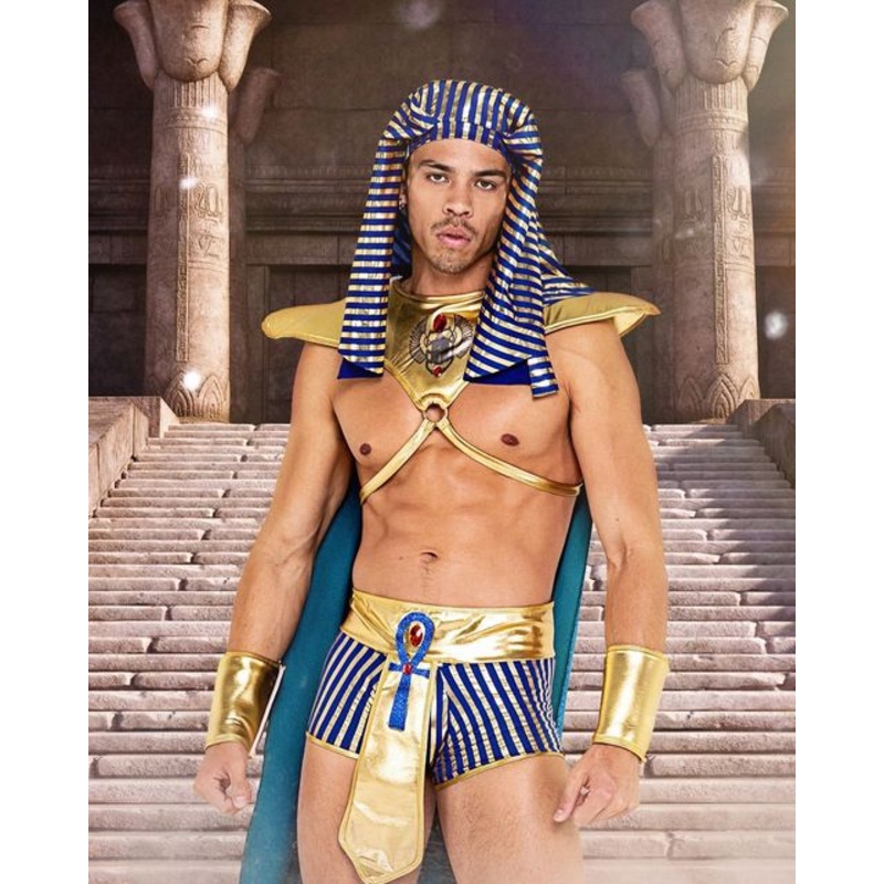 Includes Harness with Detachable Cape, Headdress, Pair of Gauntlets, Shorts, and Belt Look perfect next to your Cleopatra in this 5PC Mens King Pharaoh of Egypt character-inspired costume set that is all about authority, power, and boldness. The complete l