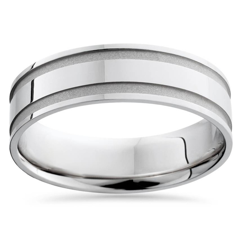 This classic men’s band features two brushed flat grooves and a polished outside edge. The band measures 6mm wide and is made of solid 10k white gold. The inside edge is slightly rounded for comfortable wear.
