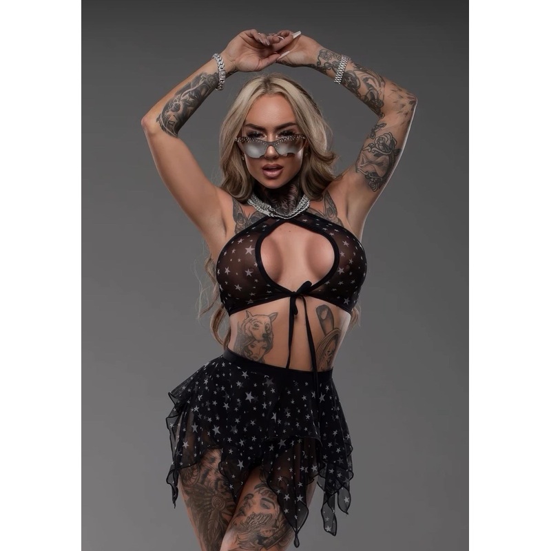 Mesh Halter Top & Flow Skirt Set Black Star S/M