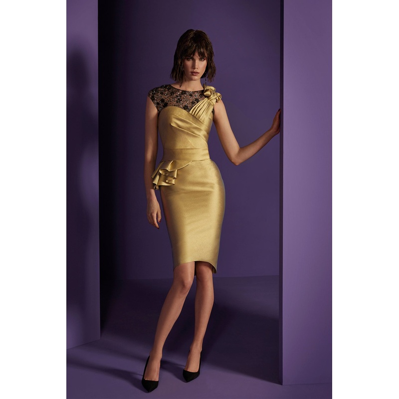 Gold Mikado sleeveless short dress. Featuring a Sabrina neckline, crafted from embroidered black sheer tulle, and a cap sleeve on one side, while the other shoulder has a golden ruffle and pleats detailing. Complemented with a fitted bodice, a side waist peplum, and a fitted short dress above the knee.