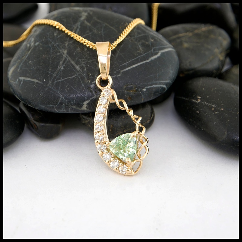 One of a kind elegant frame pendant features a 6mm .92CT Mint Garnet. This pendant is decorated by 10 diamonds in total and a spiral twist frame on one side. This pendant comes with an 18″ light curb chain.