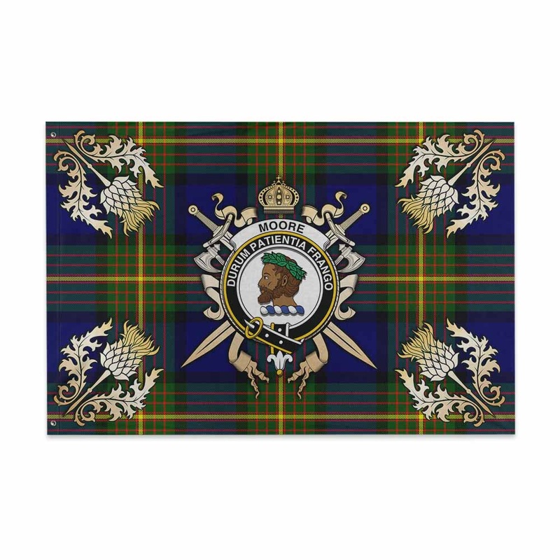 Moore Tartan House Flag with Family Crest and Golden Thistle Crossed Sword Design