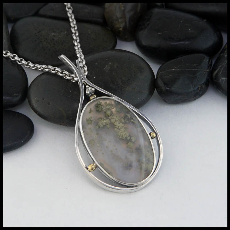 Sterling Silver framed pendant set with a stunning Moss Agate stone. A Green Sapphire is set inside the Sterling Silver Frame above the stone. Bead detailing is 18K Yellow Gold. Pendant comes on a Sterling Silver Medium Rolo Chain.Original designs Stephen