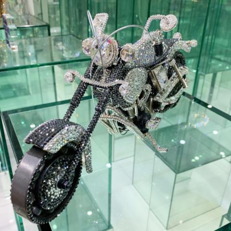 This unique masterpiece is only crafted on demand and comes with a certificate of authenticity. It features a motorcycle, which embellishing with 6,000 crystals in signature black and white colors set in with Crystals, its a stunning work of art which take