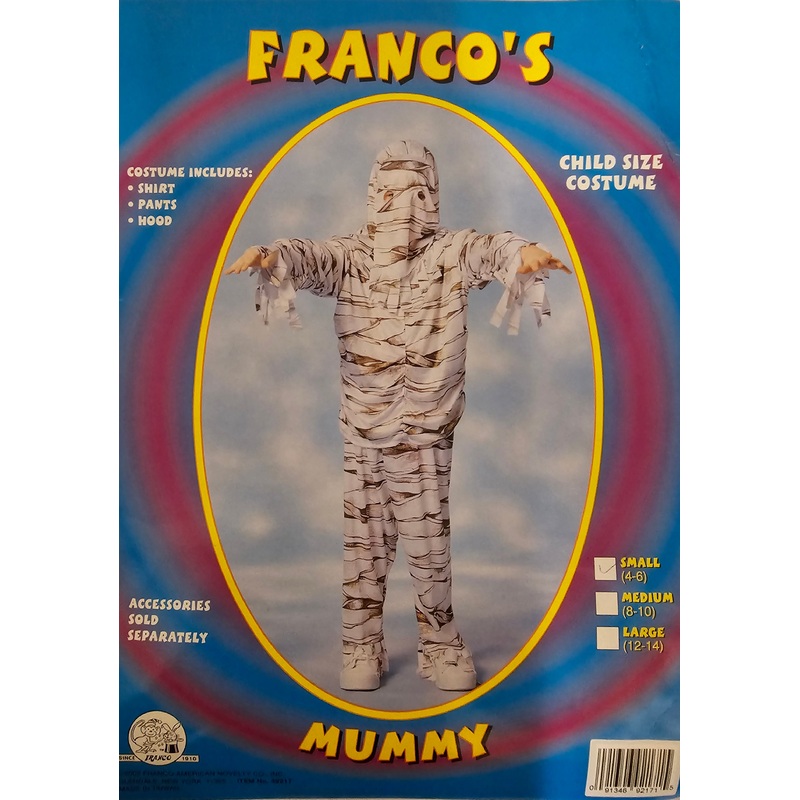 Franco's Mummy Child CostumeIncludes: Shirt, Pants, HoodColor: As ShownSize: Child Small (4-6), Medium (8-10)FRA49217