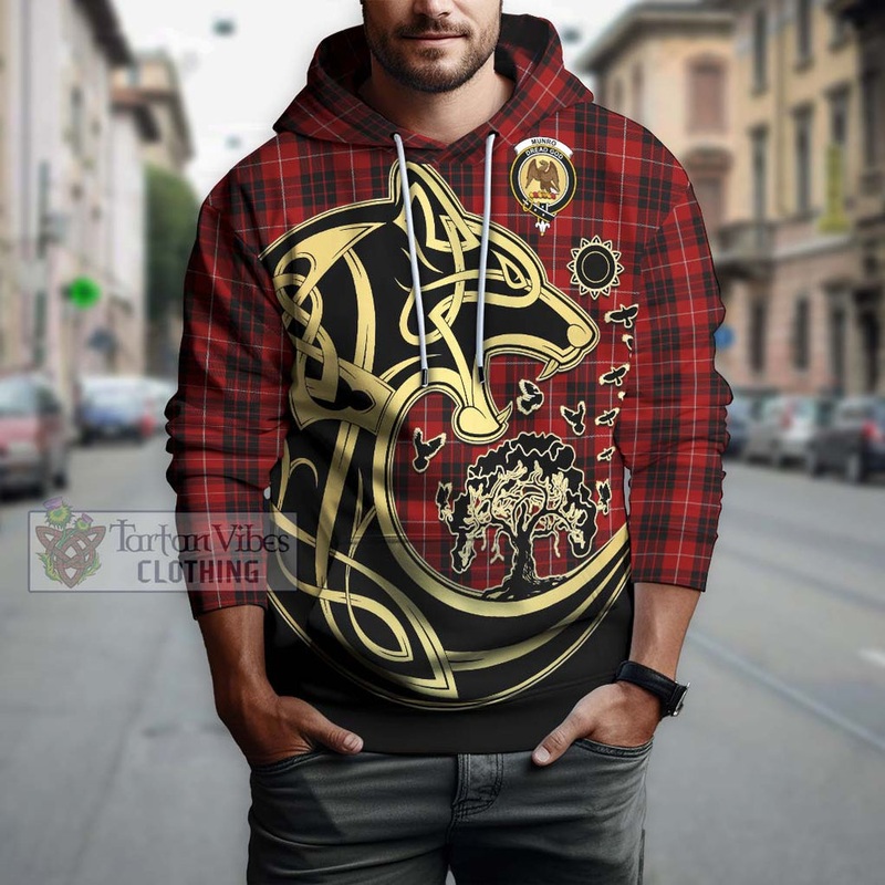 Munro Black and Red Tartan Hoodie with Family Crest Celtic Wolf Style