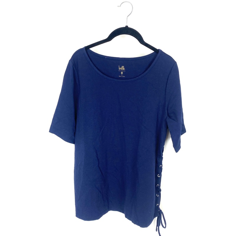 Belle by Kim Gravel navy blue scoop neck t shirt with lace up side design
