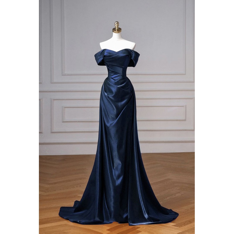 Navy Satin Long Prom Dress Elegant Off the Shoulder Party Dress J6729