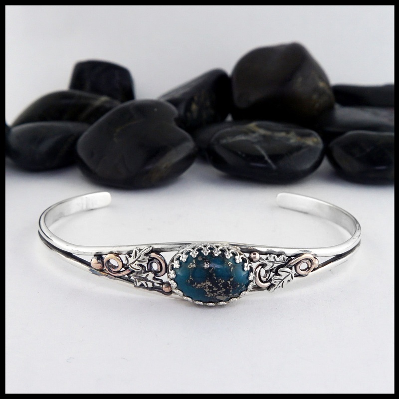 Unique Cuff Bracelet made with a sterling silver frame, setting, leaves and accented withRose Gold filled wire details and 18KRose Gold Beads. The center set stone is Turquoise. These bracelets fit a 7 inch wrist.