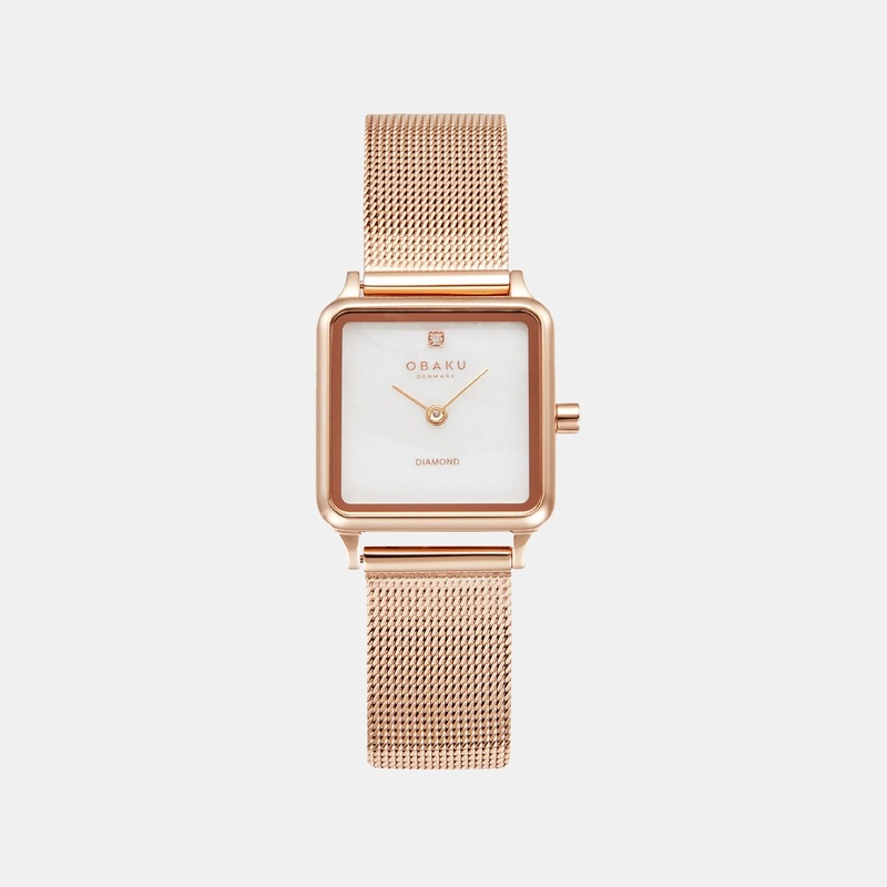 Rose gold is flattering on any wrist as it has a warm and flush appearance whether you dress casually or are going out for a special occasion. This stunning rose gold Obaku jewelry watch comes fitted with a beautiful white mother of pearl dial and a rose gold stainless steel mesh bracelet. This watch expresses the beauty of Danish minimalist design traditions, where the look is made to last. The case back is engraved with the name of the Danish designer of this watch, , who adores perfection. Go feel the smooth curves!
