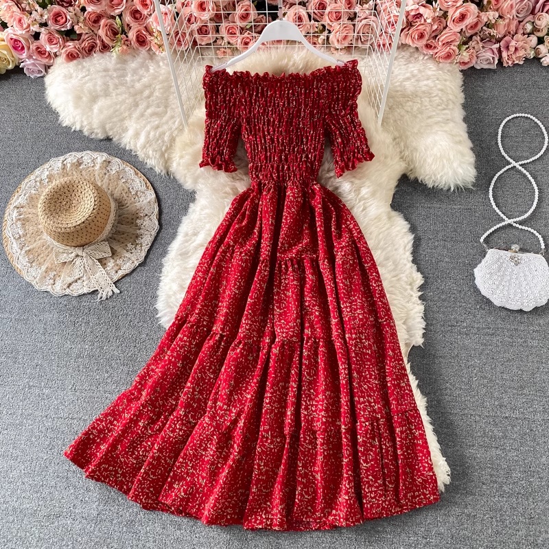 Off-the-shoulder Chiffon Dress High Waist A-line Floral Skirt 918
