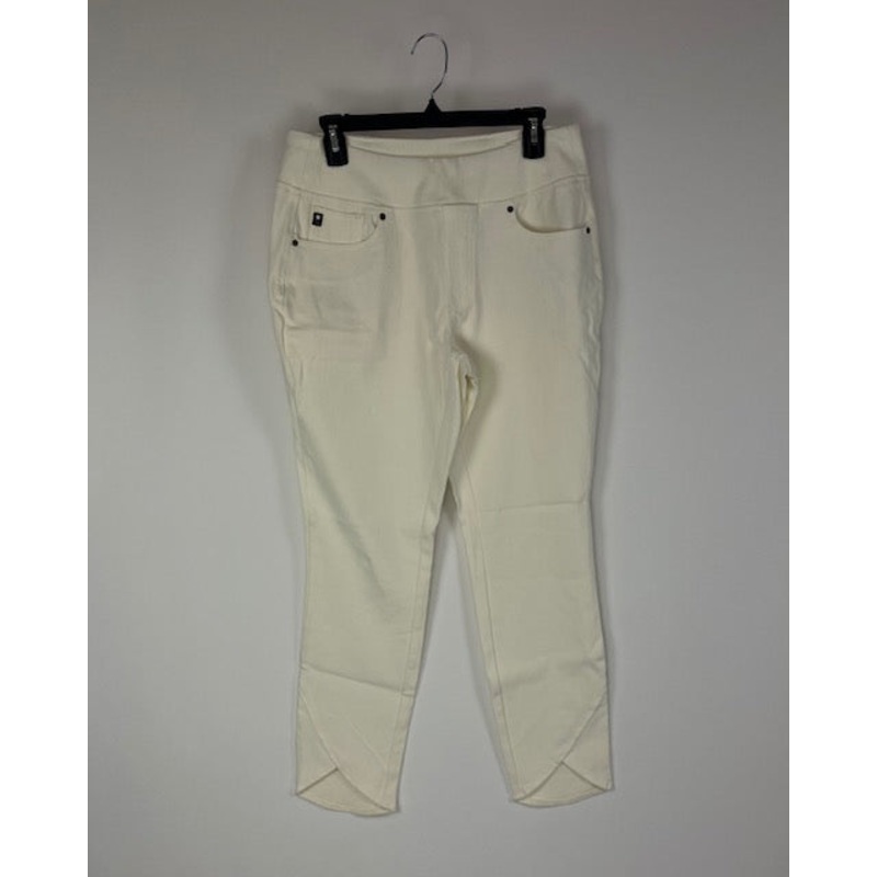 Belle by Kim Graveloff-white skinny leg fit jeggings with front and back pockets,a heart “K” charm, an uneven abstract cuff cutout, and a stretch elastic waistband, made from soft andstretchymaterials.