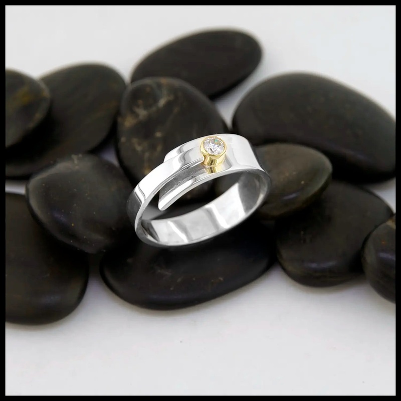 This ring showcases a bezel set .10CT diamond in 14K yellow gold in a custom sterling silver band. The band showcases an overlapping design as it links to the diamond. This ring is a size 8 1/2 and can be resized upon request.Original design Tom CarterPlea