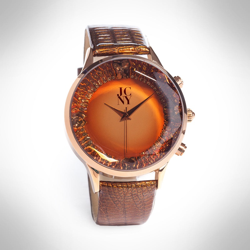 Stylish rose gold watch capped with gleaming, facet-cut crystals specially placed by the renowned Jimmy Crystal’s artisans. This timepiece offers a striking aesthetic and a signature JCNY logo at the 12 o’clock position. Constructed with a stainless steel case back, a genuine leather strap and Miyota Japanese movement, this product is lead & nickel-free with IP rose gold plating and measured 38mm in diameter. Includes a case and storage pouch.