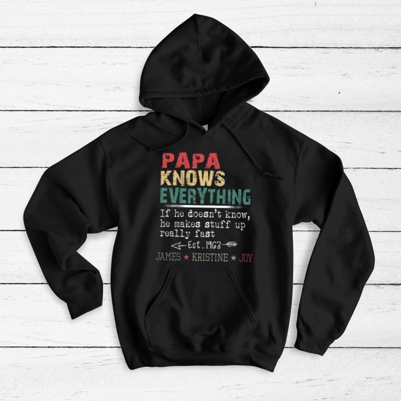 Papa Knows everything grandkidsThis hoodie is perfect to escape the cold. It covers everything from the hips to the neck, allows the person wearing it to stay toasty at all times. Plus, with the side-front pockets, the phone and the wallet can stay warm, t