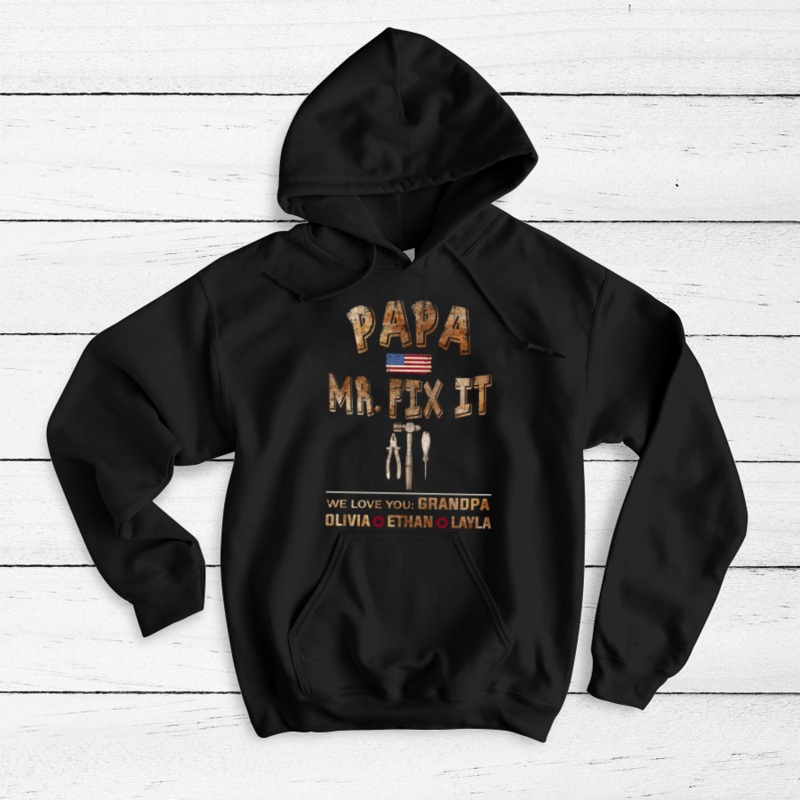 Papa Mr fix it GrandkidsThis hoodie is perfect to escape the cold. It covers everything from the hips to the neck, allows the person wearing it to stay toasty at all times. Plus, with the side-front pockets, the phone and the wallet can stay warm, too. Sui
