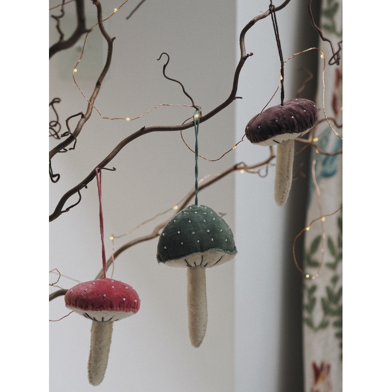 Christmas decorations don't get much more adorable (or ridiculous) than these wool and velvet fungi!Handmade with organic wool, these make a whimsical addition to any Christmas decorations.Dimensions: Between 11.5cm and 15cm tall, depending on the shape of