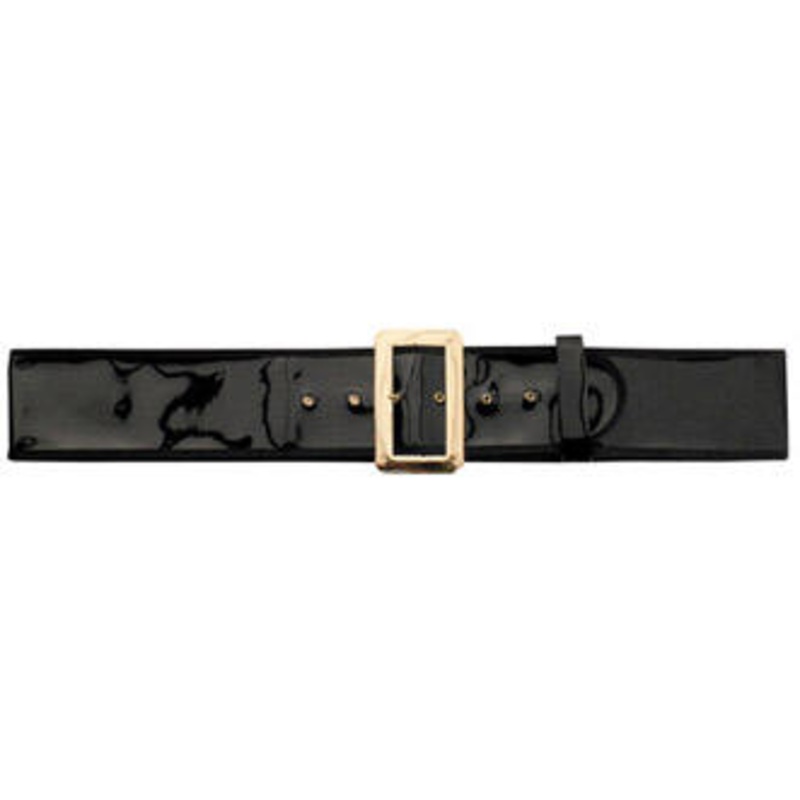 Glossy patent leather bound black belt with large gilt buckle, prong, eyelets & belt loop.