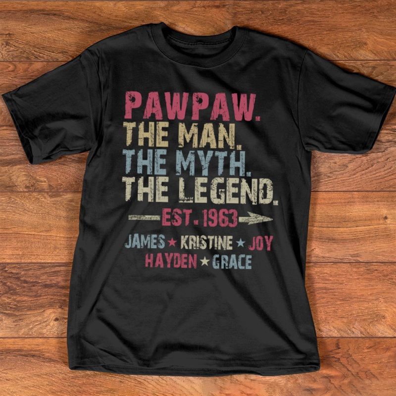 Pawpaw Man Myth Legend GrandkidsGreat as Birthday gifts or Holiday presents. This adorable item can be designed upon anyone's wish with any title.Please enter:1. Nickname. ie. Grandma, Nana, Mimi, ...etc.2. Kids' Names wanted on the shirt (Names separated