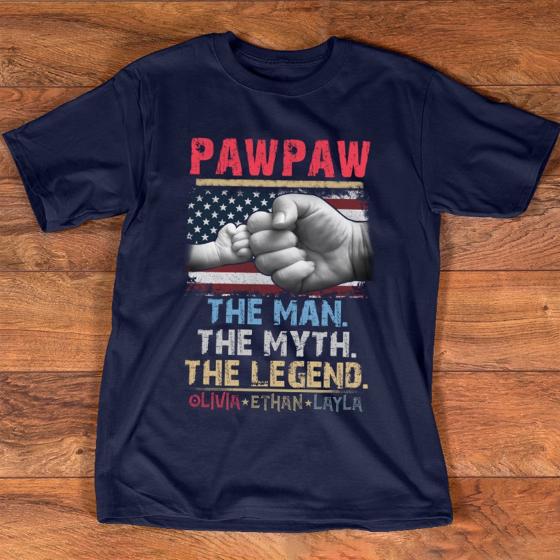 Pawpaw The Man The Myth The Legend FlagGreat as Birthday gifts or Holiday presents. This adorable item can be designed upon anyone's wish with any title.Please enter:1. Nickname: Papa, Grandpa, Pawpaw, Pop-Pop, Papaw ...etc.2. Kids' Names wanted on the shi