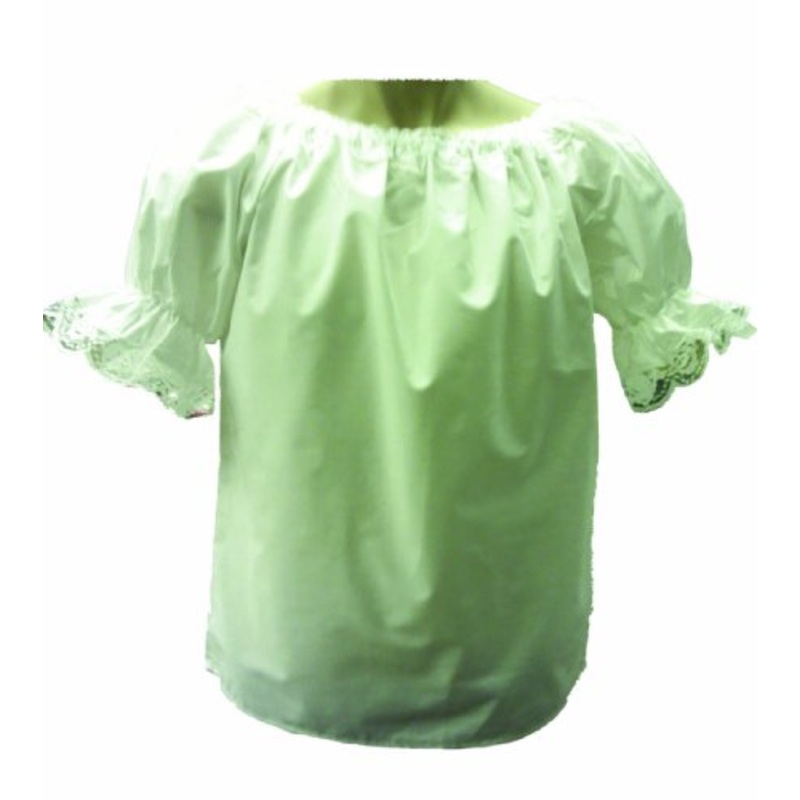 White cotton blend short sleeve peasant style blouse with white lace ruffle trim and elastic at neck and cuffs.Elbow length sleeves.Made in USA / 60% Polyester / 40% Cotton /Machine WashGreat accessory for pirate, renaissance medieval or theatrical costume