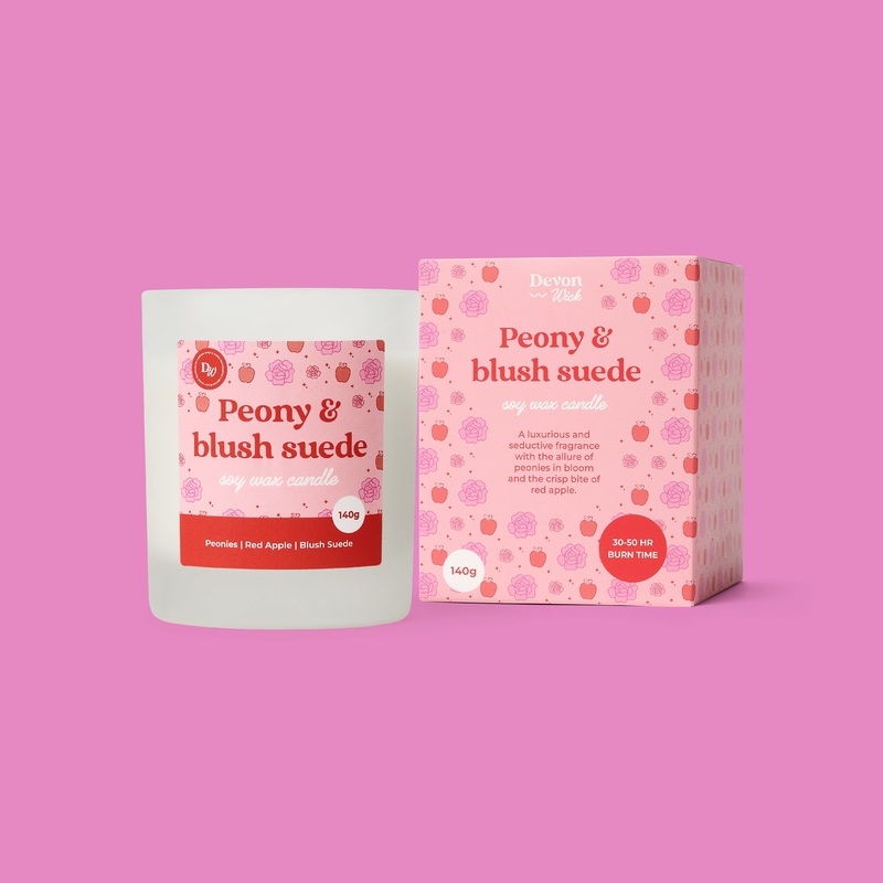 Peonies | Red Apple | Blush Suede Experience the allure of peonies in bloom with the crisp bite of red apple and the opulence of jasmine, rose, and gillyflower. This luxurious and seductive fragrance blends seamlessly with the sensuality of soft, blush sue