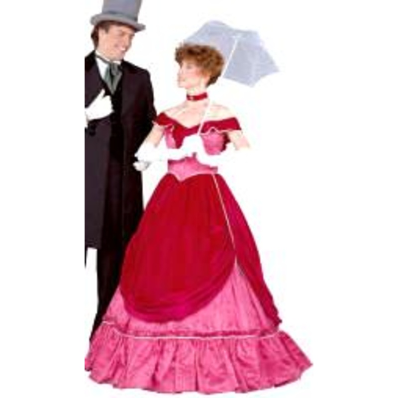 Circa 1850-1900Includes: Satin & draped velvet gown w/fully bonded bodice & antique braid trim for a true period look, full contrasting color skirt & collar.Size: S (6-10), M (10-14), L (14-16)Color: Pink(Note: Velvet Choker & parasol optional)