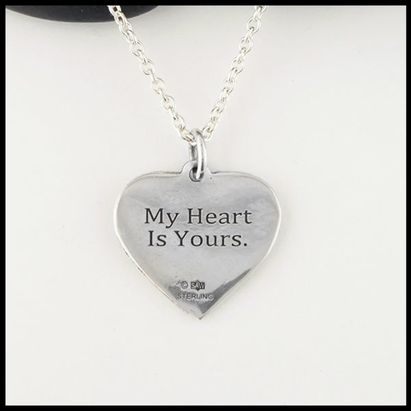 Personalize thisJeannie’s Heart Pendant with the saying, quote or date of your choice. The engraving is in Cambria font and the length of the requested engraving will impact the size of the font.