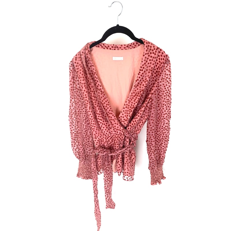 Brand new - donated from the designerShoshanna pink wrap blouse with velvet-like dusty rose polka dots, v-neckline, long balloon sleeves with smocked cuffs, and a matching belt that goes through the blouse and tied into the front creating the "wrap"Small (