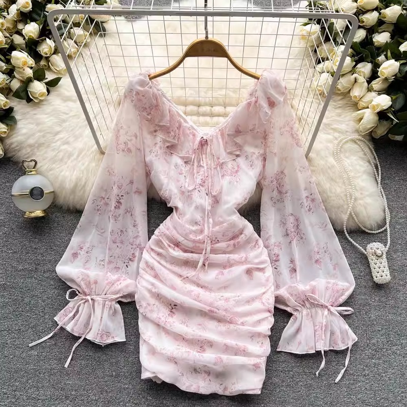 Pink Floral Fairy Dress Summer Chiffon V-neck Slim Skirt 1007