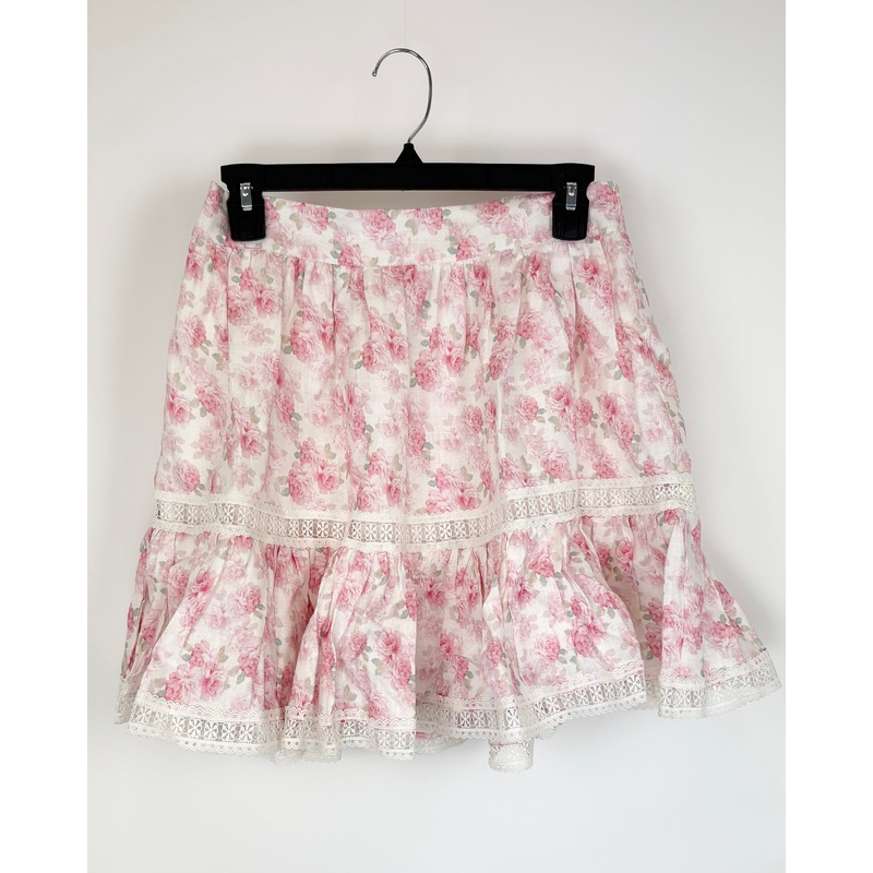 Cami NYC pink floral lace mini skirt with two ruffle tiers separated by a lace trim, and elastic waistband in the back half