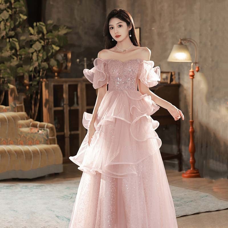 Product NO. :33Dress style: Off shoulderFabric: TulleColor: PinkSleeve type: Short sleevesWaist type: Middle waistSize: XS,S,M,L,XL,XXL,XXXLDress length: Long