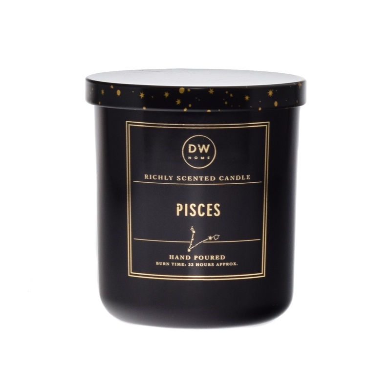 FRAGRANCE PROFILEPisces are born dreamers and very empathetic by nature. They are quite sensitive but reflective as well. Notes of peony, cedar and leafy greens suit their creative nature best.DETAILSMedium Single WickBurn Time: Approx. 33 hours |Dimension