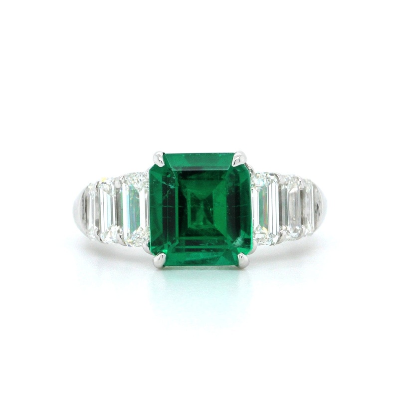 Platinum Emerald Ring with Emerald Cut Diamond Sides