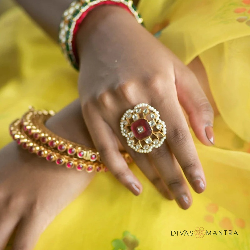Material & Composition:92.5 Sterling SilverStones:White Kundan Stone, Red Kundan Stone, PearlsStyling:This Ring can be paired withSINIVALI Earrings, Pipaala Tikka, Prajana Necklace and Quincunx Bangle.https://divasmantra.com/products/sinivali-earringshttps
