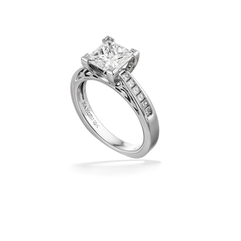 18K White Gold Na Hoku Solitaire Engagement Ring with a Princess Cut 2.01 H SI1 Center Diamond and 0.30 Carats (total weight) of Side Diamonds. The center diamond is engraved and accompanied by a GIA Certificate (Gemological Institute of America).
