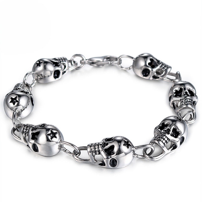 Unleash your inner rebel with our European and American Domineering Totem Stainless Steel Skull Bracelet. This striking piece combines retro punk aesthetics with a contemporary edge, making it the perfect accessory for the modern man.
